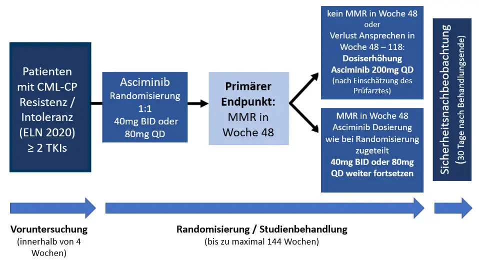 Der Zweck der aktuellen Studie ist die Optimierung der Behandlung mit Asciminib in zwei unterschiedlichen Dosierungen, in Patienten mit CML-CP, die zuvor mit 2 oder mehr Tyrosinkinase-Inhibitoren (TKIs) behandelt wurden und diese nicht vertragen bzw. mit dieser Standardbehandlung kein entsprechendes Ansprechen, per European Leukemia Network (ELN) Guideline 2020, erreicht haben.