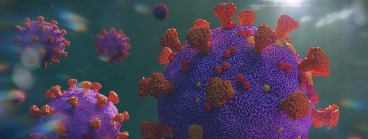 Header Image entnommen aus Adobe Stock: Bei der Betrachtung von SARS-CoV-2, dem Virus, das COVID-19 auslöst, werden kleine Spitzen auf der Oberfläche sichtbar