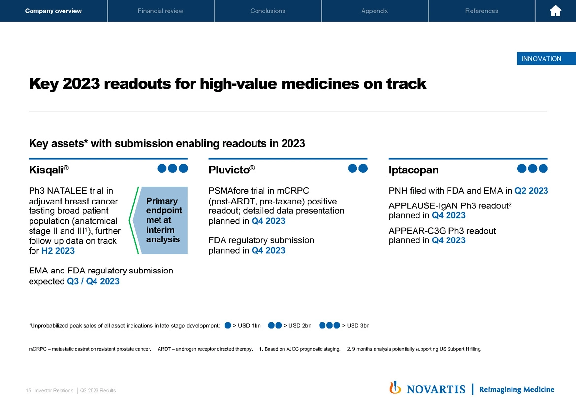 Then moving to Slide 15 and turning to our pipeline. A couple of notes here. Our key 2023 readouts are on track. That includes the Kisqali® data, which I've already mentioned; the Pluvicto® updated analysis, which I've also mentioned; as well as iptacopan, where you're aware, we've filed in both – PNH both in the US and the EU. We used a priority review voucher as well in the US. We also are on track to read out the APPLAUSE-IgAN Phase III study in quarter 4 as well as the APPEAR-C3G data readout as well in Q4 of 2023.
