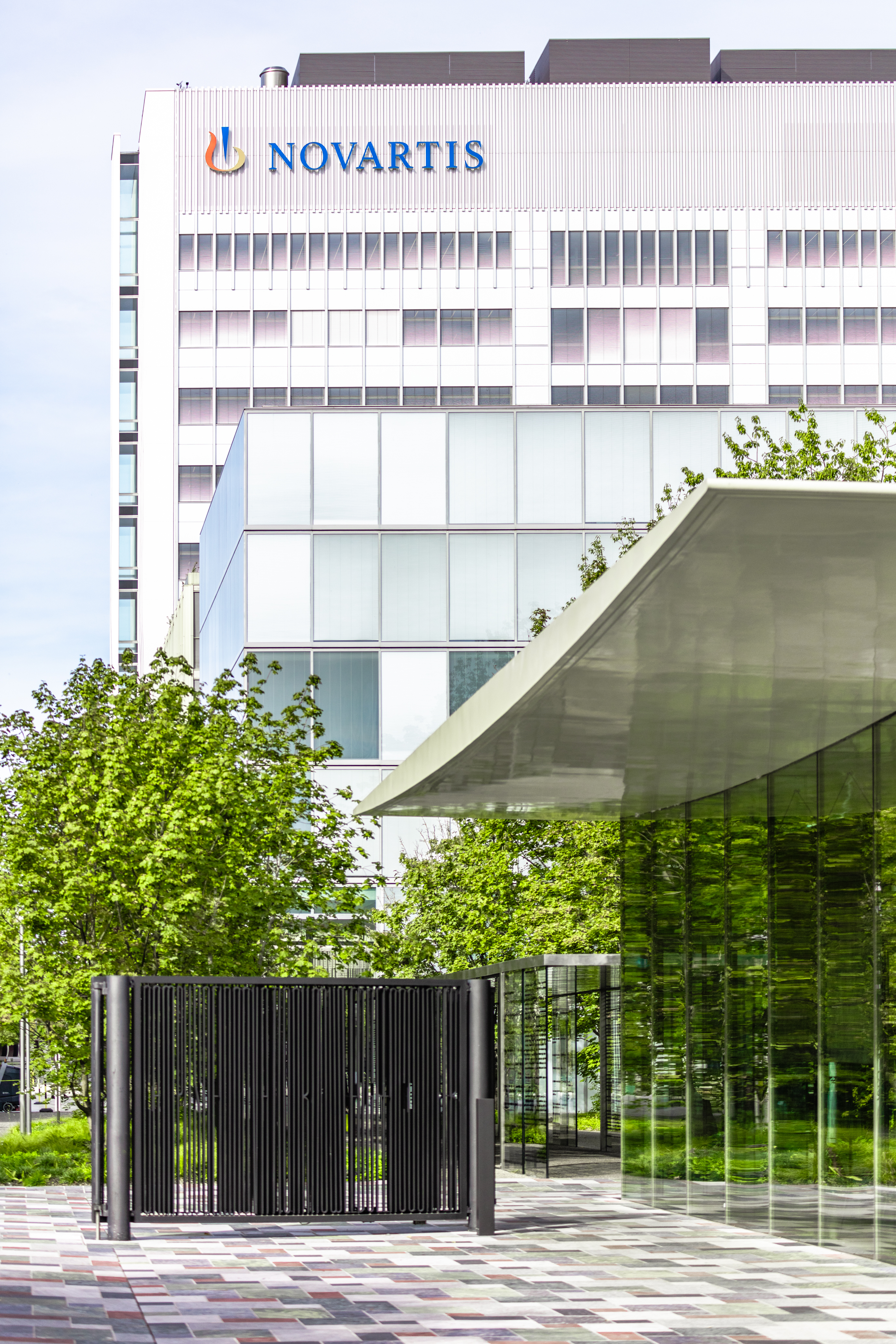 View of the Novartis logo on the Banting 1 building from the main gate, Novartis Campus Basel (vertical)