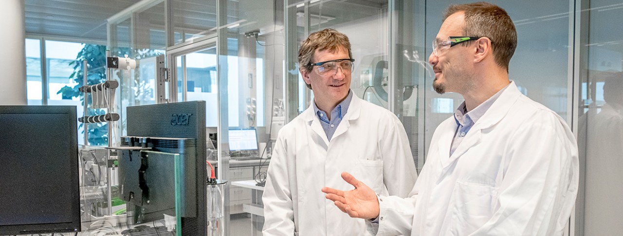 Main image: Biologist Johannes Ottl and chemist Frederic Berst work side-by-side to craft DNA-encoded libraries to facilitate the discovery of drugs for hard-to-drug targets. Image by Christian Jaeggi.