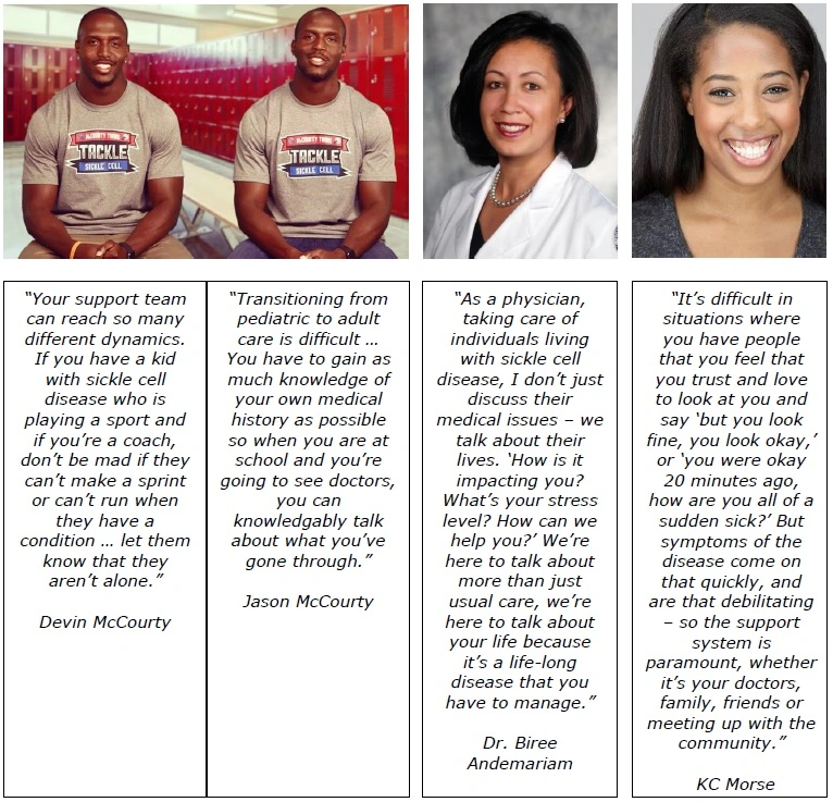 The McCourty twins joined Dr. Biree Andemariam (Director, New England Sickle Cell Institute and Chief Medical Officer of the Sickle Cell Disease Association of America) along with SCD patient and aspiring actress KC Morse to raise awareness of and open a forum for this often misunderstood disease. The panel’s purpose was to help the public understand not only the chronic pain that SCD patients experience, but the emotional and social impact of the disease that are regularly overlooked.